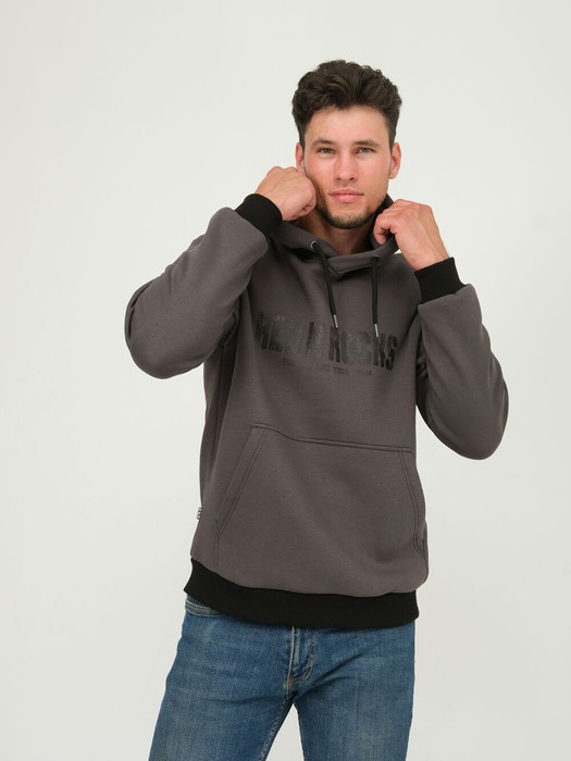 Толстовка мужская из плотного трикотажного полотна, без застежки. Куртка прямого силуэта, с капюшоном, рукав втачной. Карманы типа "кенгуру". По краю капюшона проходит широкий плетеный шнур. Логотип вышит на полочке.