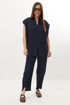 Блуза А-силуэта. Выполнена из лёгкого струящегося полотна черного цвета. Горловина стойка-лента, формирующая бант сзади. По спинке верхняя часть с вырезом-качелью. Длина по боковому шву 39 см