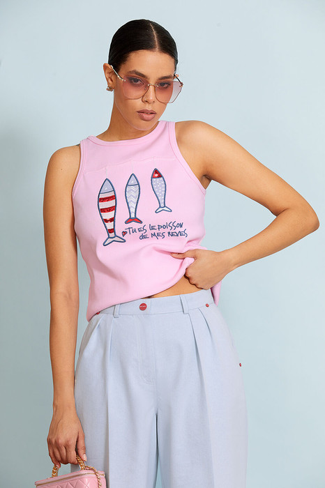 Топ  выполнен из трикотажного полотна в рубчик. Изделие  приталенное. Горловина круглая. Линия плеча зауженная. На полочке авторская вышивка.