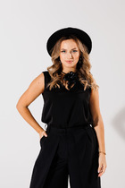 Отделочным элементом блузы является кружево, настроченное на верхней части переда и спинки. На кружево пришиты бусины.
