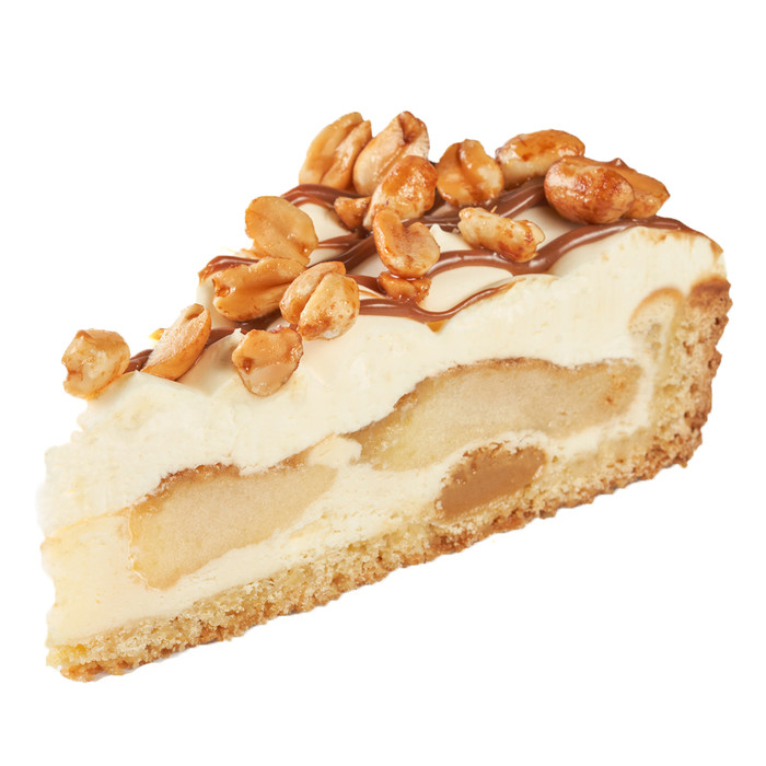 Cочетание песочного теста, яблок и карамели, вкус которых обогатил крем на основе крем-чиз и воздушные сливочные пики. Текстуру десерта подчеркивает жареный арахис.
