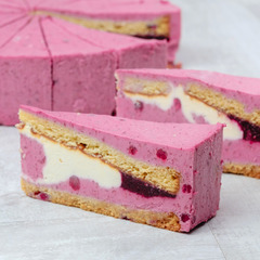 Между двумя воздушными бисквитами невероятно нежный крем, ягодный конфитюр и муссовый слой с брусникой. Лёгкий торт с благородной ягодной кислинкой.