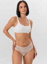 Трусики-боксер из эластичной ткани в горошек, эластичной сетки и узкого кружева. Передняя деталь декорирована небольшим бантиком. Внутренняя ластовица выполнена из хлопка.В комплект можно подобрать 79939.