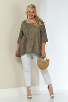 Туника женская из гладкокрашенного полотна «кулирка», свободного кроя, со спущенной линией плеча, втачными рукавами длиной до локтя, горловиной V-образной формы обработанной втачной планкой и принтом на полочке выполненным в технике «шелкографии». Модным элементом является разность длин фигурного низа изделия: низ полочки – прямой укороченный, низ спинки – удлиненный скруглённой формы.