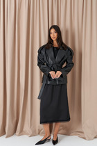 Юбка мини в бандажном стиле, выполненная из плотной эластичной ткани в рубчик. Перед декорирован асимметричным подолом и декоративными швами. Застежка-молния сзади. Без подкладки.