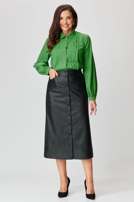 Юбка женская А-силуэта, выполнена из экокожи, длиной миди. Перед с боковыми карманами, с застёжкой на петли и пуговицы. Спинка со швом посередине. Юбка на притачном поясе частично с эластичной тесьмой. Изделие на подкладке.