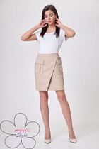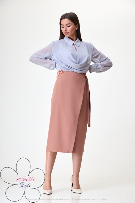 Юбка с элементом запаха, на притачном поясе. Выполнена из костюмной ткани в чёрном цвете, без подкладки.  В новейших моделях запах располагается спереди сбоку. Это формирует изящный вырез треугольной формы, который смотрится очень женственно.