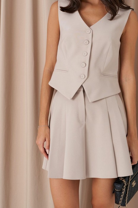 Юбка-мини. Выполнена из плотного текстильного полотна бежевого цвета. С подкладкой. Силуэт - трапеция. По всей окружности складки. Пояс стабильный. Застёжка пуговица и молния. В боковых швах карманы. Длина 43 см (с учётом пояса)