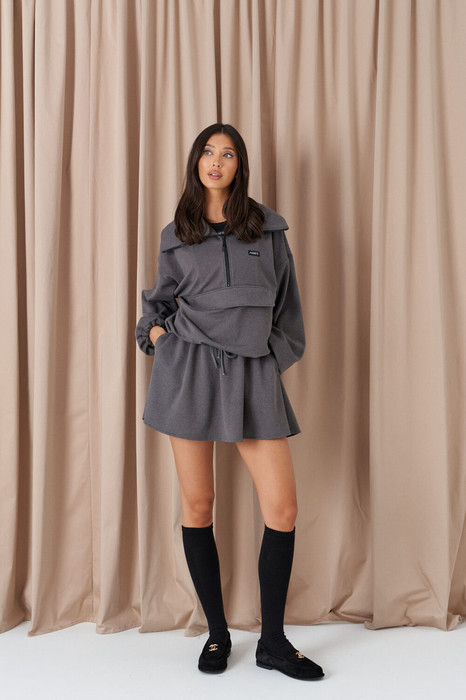 Юбка-мини свободного кроя. Выполнена из хлопкового трикотажного полотна графитового цвета. Характеристика: свободный корой, без подкладки, пояс не резинке с кулискойком, в боковых швах карманы. Длина юбки по боковому шву 38 см