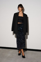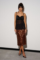 Юбка прямого кроя выполнена из бархатного полотна светло-коричневого цвета с пайетками. Характеристики: прямой крой, подкладка, пояс на резинке. Длина 80 см.