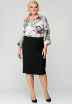 Юбка прямого силуэта, с фигурной кокеткой по переду и разрезом-шлицей. Заднее полотнище со средним швом, в котором обработана застежка потайная. Верх юбки обработан обтачками.  Длина по боковому шву 64 см. Юбка на подкладке.
