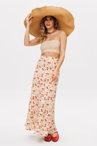 Юбка длинная прилегающего силуэта на притачном поясе. По переду вертикальные вытачки от пояса и центральным швом внизу заканчивающимся высоким разрезом. Спинка с 2-мя вертикальными вытачками от пояса, центральным швом и застежкой на потайную тесьму-молнию в центральном шве. Юбка на подкладке.
