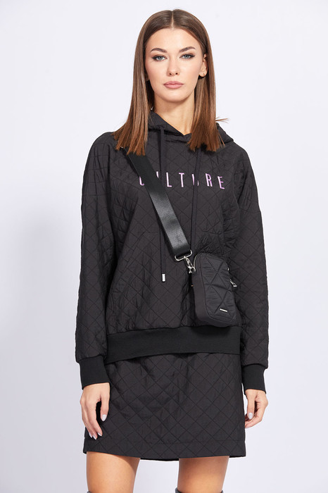 Юбка выполнена из костюмно-плательной ткани, имитирующей стежку. Юбка на притачном поясе, прямого силуэта, длиной выше линии колена. Застежка сзади в среднем шве на потайную молнию  и пуговицу. В р.50-54 есть разрез сзади в среднем шве. Юбка на отлетной по низу подкладке.
