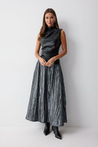 Юбка выполнена из костюмно-плательной ткани с блеском. Юбка прямого силуэта, зауженная к низу, длиной миди. Юбка на поясе, застегивающимя на петлю и пуговицу и на потайную молнию сзади в среднем шве. Юбка на отлетной по низу подкладке. В комплект входит два съемных ремня из основной ткани с обтяжной пряжкой и блочками.