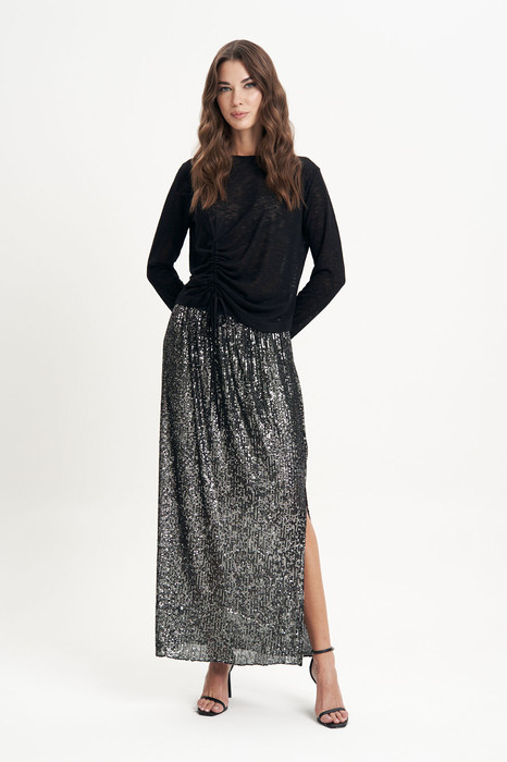 Тренд на металлический блеск в одежде триумфально ворвался в нашу жизнь, а вместе с ним - блестящие юбки макси длины. Чем не повод приобрести для себя такую юбку из трикотажной пайетки. Она, как нельзя лучше, подходит для создания стильного, нарядного образа. Юбка прямая, длинная на эластичном поясе и подкладке. Длина юбки около 90 см.