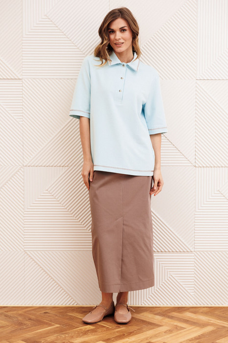Юбка прямого силуэта выполненная из джинсовой ткани. Передняя честь юбки с вытачками, со средним швом и застежкой гульфиком на молнии и щлицей спереди. Задняя часть юбки с вытачками. Юбка на притачном поясе с затежкой на петлю и пуговицу спереди и резинками по бокам.  Длина юбки с учетом пояса - 90 см.