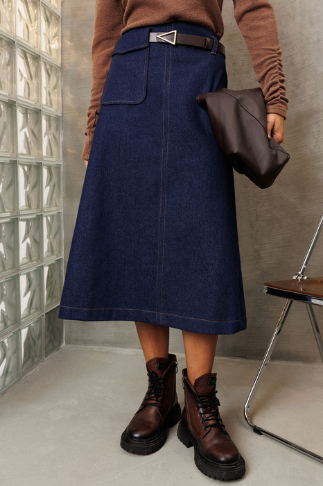 Юбка А-образного силуэта из плотного джинса. Передняя часть юбки со средним швом. С правой стороны вверху настрочен карман с клапаном- шлевкой. Задняя часть юбки со средним швом и вытачками. Сверху в среднем шве обработана потайная молния. Вдоль линии пояса настрочены шлевки. Пояс цельнокроеный на обтачке. Юбка на подкладке. Вдоль среднего шва по переду и по периметру кармана проложена декоративная строчка. К юбке прилагается сьемный ремень. Фурнитура может быть изменена с охранением художественного замысла. Длина юбки - 78 см, длина рукава - 60 см.