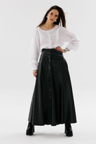 Юбка-карандаш из однотонной костюмной ткани. Модель на кокетке, дополнена шлевками под ремень. По бокам выполнены накладные карманы. В боковом шве – застежка на потайную молнию. Низ ровный, дополнен разрезом со встречными веерными складками. На подкладе.