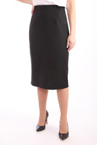 Юбка-карандаш из однотонной костюмной ткани. Модель на кокетке, дополнена шлевками под ремень. По бокам выполнены накладные карманы. В боковом шве – застежка на потайную молнию. Низ ровный, дополнен разрезом со встречными веерными складками. На подкладе.