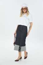 Джинсовая юбка длины миди с высоким разрезом по переду и боковым карманом с одной стороны. Застёжка юбки ассиметричная в виде молнии и пуговицы. По низу юбки выполнен подворот с имитиацией застёжки на пуговицы.