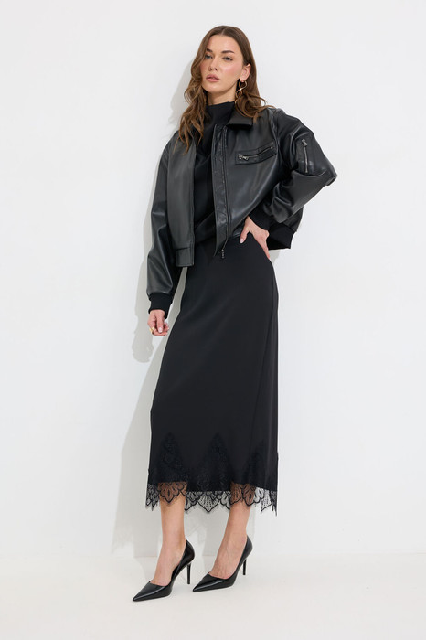 Юбка прямого силуэта из струящейся ткани. По верху юбки притачной пояс с резинкой по задней половинке пояса от бокового шва до вытачки. В центральном шве потайная молния, по низу разрез. По низу юбки декоративная тесьма( кружево). Обращаем ваше внимание, что фурнитура может отличаться от фото.