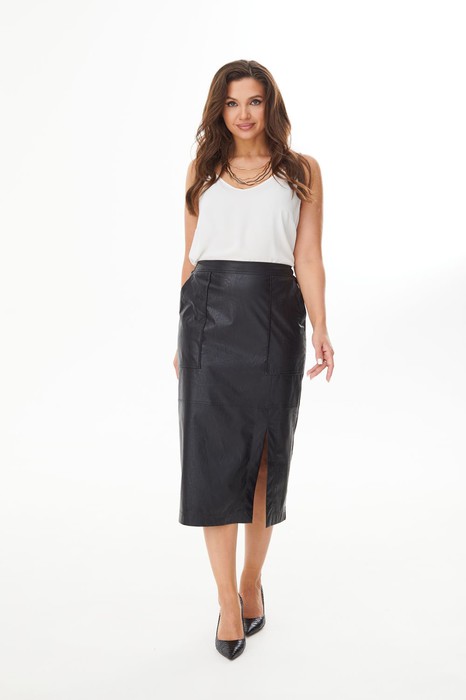 Юбка прямого силуэта из экокожи на подкладке. Спереди - горизонтальный рельеф, из рельефа по переду слева разрез. Накладные карманы с косым входом. Пояс прямой сзади на резинке. Сзади застежка - молния.