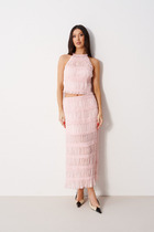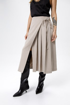 Элегантная юбка прямого силуэта длиной миди с разрезами на переднем и заднем полотнищах. Переднее полотнище с частичным запахом, имитацией боковых карманов с отрезным бочком. Заднее полотнище со средним швом, отрезной кокеткой, накладными карманами. Пояс притачной.