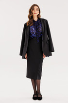 Юбка прямого силуэта длиной миди. Левая вытачка на переднем полотнище переведена в вертикальный шов, в котором от середины бедра оформлена шлица. На заднем полотнище две пары вытачек и средний шов. Пояс притачной.