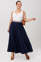 Юбка - солнце с узким поясом. В боковых швах расположены карманы. Застёжка центральная на петли и пуговицы. В комплект к юбке идет широкий пояс из основной ткани.