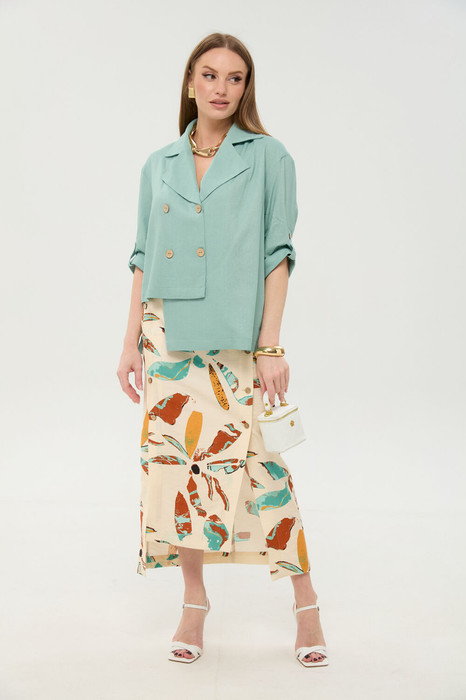 Юбка длиной миди, расклешенная к низу, с асимметричным низом. Пояс притачной, по спинке собран на резинку. Переднее полотнище состоит из трех частей. Правая часть скреплена отделочной строчкой и кнопками. В боковых швах изделия расположены карманы. По спинке изделия идёт средний шов и две вытачки для удачной посадки по фигуре. Юбка без подкладки.