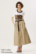 Женственная юбка силуэт трапеция   длины миди. По переду заложены встречные складки.  Имеются боковые карманы. Эта модель подчеркивает стройность фигуры и слегка приоткрывает ножку.