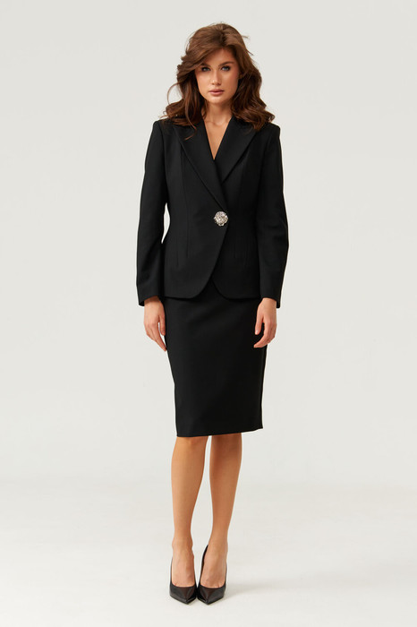 Женская юбка из смесовой ткани для повседневной носки. Полуприлегающий силуэт обеспечивает комфорт и стильный внешний вид. Верхний срез юбки обработан обтачкой, что придает изделию аккуратный и завершенный вид. Заднее полотнище украшено четырьмя талиевыми вытачками для лучшей посадки и формы, а также располагается средний шов с потайной застежкой-молнией обеспечивает удобство при надевании и снятии юбки. На заднем полотнище в среднем шве расположен разрез-шлица, добавляющий свободу движений и стильный акцент. Юбка выполнена на поливискозной подкладке, что обеспечивает комфорт при носке. Цвет — черный, универсальный и легко сочетаемый с различными топами и обувью.
