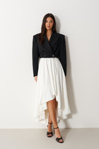 Модель прямого силуэта, на притачном поясе со шлёвками, на подкладе. Спереди карманы в подрезных бочках и высокий разрез в среднем шве. Сзади в среднем шве обработанана шлица, застёжка на потайную молнию и пуговицу на поясе. Ремень в комплект не входит.