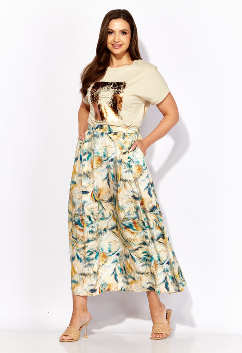 Элегантная шифоновая юбка, удлиненная, расширенная к низу. По переду юбки-функциональные наклонные карманы и мягкие складки Пояс притачной, частично-на резинке. Юбка с подкладкой.