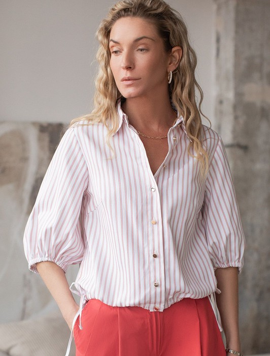 Состав: 65%Хлопок 35%ПЭ Плотность: 115 Г/м2Укороченная блузка белого цвета в коралловую полоску из хлопка идеальна на весну и лето. Такой вид полосатой ткани называется пестротканой — полосы созданы переплетением нитей разных цветов. Смешанный состав ткани идеален для деловых блузок: хлопок приятен к телу, полиэстер повышает долговечность. Стильная модель с пышными рукавами буфами создает эффектный и женственный образ, который подойдет как для деловой работы, так и для повседневной носки. Блузка дополнена пуговицами из натурального перламутра — это экологичная долговечная фурнитура с уникальным сиянием. Практичная кулиска по низу держит форму изделия, подчеркивая талию и создавая аккуратный силуэт, а так же позволяет регулировать посадку, добавляя функциональности и удобства. Благодаря сочетанию качества материала и продуманного дизайна, рубашка хорошо сидит и на больших размерах, обеспечивая комфорт и свободу движений. Короткие рукава фонарики придают образу модный акцент, делая его более выразительным и динамичным. Натуральная ткань гарантирует комфорт и воздухопроницаемость, что особенно важно в теплое время года.