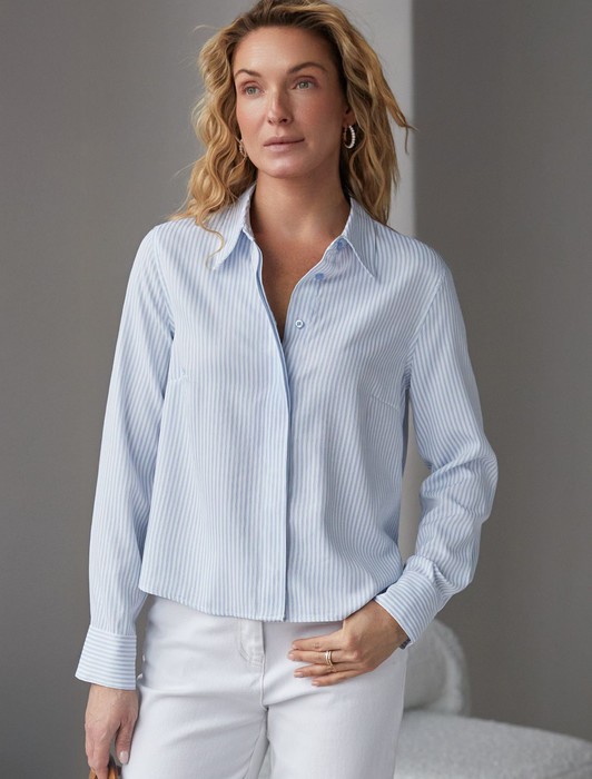 Состав: 65%Хлопок 35%ПЭ Плотность: 112 Г/м2Стильная укороченная блузка белого цвета в голубую полоску создана для комфорта в любой ситуации. Хлопок делает модель приятной для тела и хорошо дышащей, что особенно важно в течение долгого дня. Свободный крой не ограничивает движения, подходит на любую фигуру и гармонично смотрится в разных образах. Всегда актуальный принт в полоску визуально вытягивает и стройнит фигуру, добавляет образу динамики, делая блузку эффектным акцентом в гардеробе. Повседневная блузка держит форму даже после продолжительной носки, что помогает всегда выглядеть аккуратно. На спинке блузки расположена встречная бантовая складка с наклоном, что создаёт красивый визуальный эффект и придаёт дополнительный объем. Рукава обработаны широким манжетом на 2 пуговицы. Дополнительная пуговица на планке рукава не даёт раскрываться и топорщиться разрезу. Отложной воротник придает классический вид,, подходящий для офисных будней. Особенно стильно рубашка смотрится в непринужденных, городских или повседневных комплектах.
