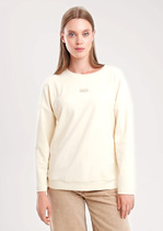 Объемный свитшот из двухцветного трикотажного футера. Внутренняя сторона изделия представлена в натуральном цвете хлопка, внешняя в нежно-голубом. За счет использования крашенной пряжи, данный вид полотна прошел минимальную обработку, что придало изделию мягкость и шелковистость.