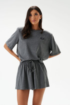 Джемпер поло с короткими рукавами из плотного гладкого трикотажа интерлок с V-образным вырезом. Спущенное плечо придает изделию свободный силуэт.