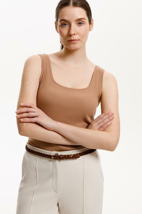 Классическим элементом гардероба является базовый топ в рубчик. Узкие бретели и глубокий вырез делают изделие комфортным в носке и универсальным в повседневной жизни.