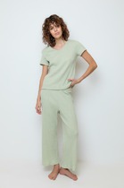 Легкий комплект для комфортного сна и отдыха. Свободная футболка с принтом и спущенной линией плеча комфортно садится по фигуре. Укороченные брюки с удобными боковыми карманами выполнены из набивного трикотажа. Гладкий материал приятен к телу и позволяет коже дышать.