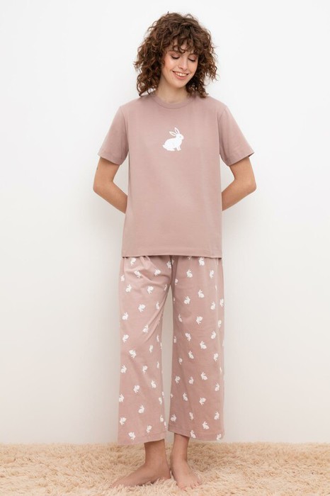 Комплект для сна и отдыха из натурального хлопка с добавлением лайкры. Футболка стандартной длины с принтомкомфортно садится по фигуре. Укороченные просторные брюки с карманами из набивного трикотажа с мягким поясом на резинке.
