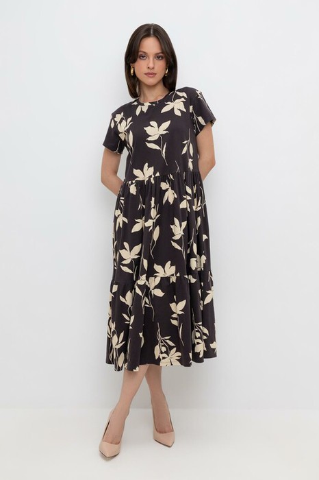 Легкое платье с круглым вырезом со сборками, короткими рукавами из набивного трикотажа супрем. Все трикотажные полотна производятся в соответствии с нормами Швейцарского сертификата ЭкоТекс. Сделано в России