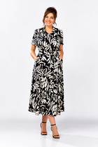 Платье с круглым вырезом и короткими рукавами из плотного набивного трикотажа интерлок. Модель с трапециевидной юбкой и боковыми карманами.