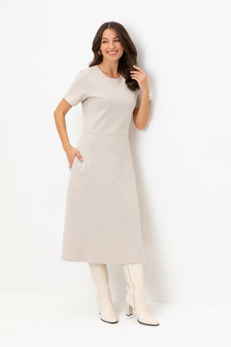 Платье с круглым вырезом и короткими рукавами из плотного трикотажа интерлок. Модель с трапециевидной юбкой и боковыми карманами.