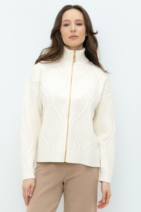 Вязаный кардиган на молнии с высоким воротником-стойкой из полушерстяной пряжи. Спущенное плечо и прямой силуэт придают изделию свободный объем.