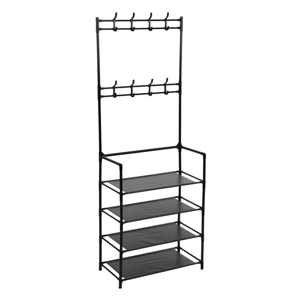 Вешалка VETTA напольная с крючками и полками для обуви, с помощью которой удобно хранить все самое необходимое перед выходом из дома или офиса. Ее можно использовать в качестве хранения аксессуаров, легкой одежды, стеллажа или обувницы. В комплекте идут 8 крючков (из пластика), которые легко крепятся к штангам вешалки вверху (надеваются сначала на верхнюю перекладину и защёлкиваются на нижнюю). Полки из нетканого материала. Вешалка поставляется в разобранном виде в плоской коробке (инструкция, крепёж, инструмент в комплекте).