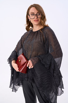 Блузка с удлиненными манжетами выполнена из тончайших нитей плотного сатина, плетение которых создает полуматовый блеск, напоминающий натуральный шёлк. На спинке изделия фирменный логотип бренда. Застежка на золотистые пуговицы. Совет стилиста: сочетайте блузку в костюме с брюками D24.534 и юбкой D26.461 чтобы создать роскошный праздничный образ, с классическими брюками или блестящим денимом.