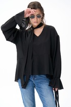 Стильная блузка черного цвета из сатина с удобной застежкой на пуговицу на спинке. Прямой крой и короткий рукав делают модель универсальной для любого сезона. Благородный блеск ткани подчеркивает элегантность, а удобная посадка обеспечивает комфорт. Благодаря эластану в составе ткань сохраняет первозданный вид, не образуя заломов. Ваш образ будет безупречен весь день! Блузка легко комбинируется с деловой одеждой и casual-вещами, подходит для разных случаев.