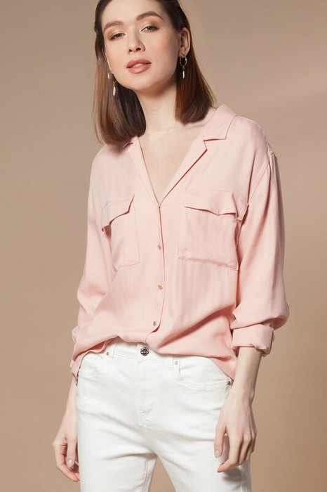 Блузка прямого силуэта. Выполнена из мягкой вискозы в рубчик. Плетение придает ткани плотности и легкого благородного блеска. Воротник с небольшим лацканом - тренд сезона. Карманы накладные с клапанами.