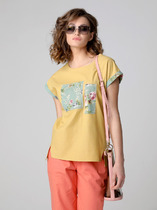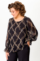 Свободный крой блузки и спущенная линия плеча  дарят ощущение легкости и непринужденности, делая образ одновременно женственным и современным. Широкие рукава средней длины гармонично дополняют образ и идеально подходят для полных рук, обеспечивая комфорт, свободу движений и уверенность. Аккуратная застежка на маленькую пуговицу добавляет утонченности, а круглый вырез красиво обрамляет шею, создавая аккуратную линию декольте.